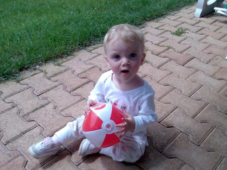 Je voulais vous présenter mon « baboooooo », le ballon avec lequel je joue chez nonno et nonna : il est beau grand, rouge et blanc ! Je l’aime beaucoup.