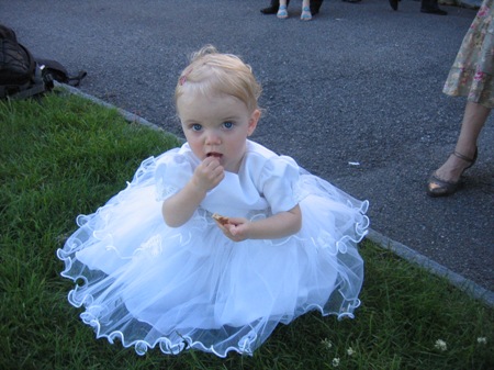 Maman et papa m’ont mis la belle robe blanche que j’ai reçue à mon baptême de la part de la maman de pepe (mon parrain) : comme j’étais en blanc, beaucoup de gens ont cru que c’est moi que Patrick mariait !!! Ils sont bêtes les gens parfois !!
